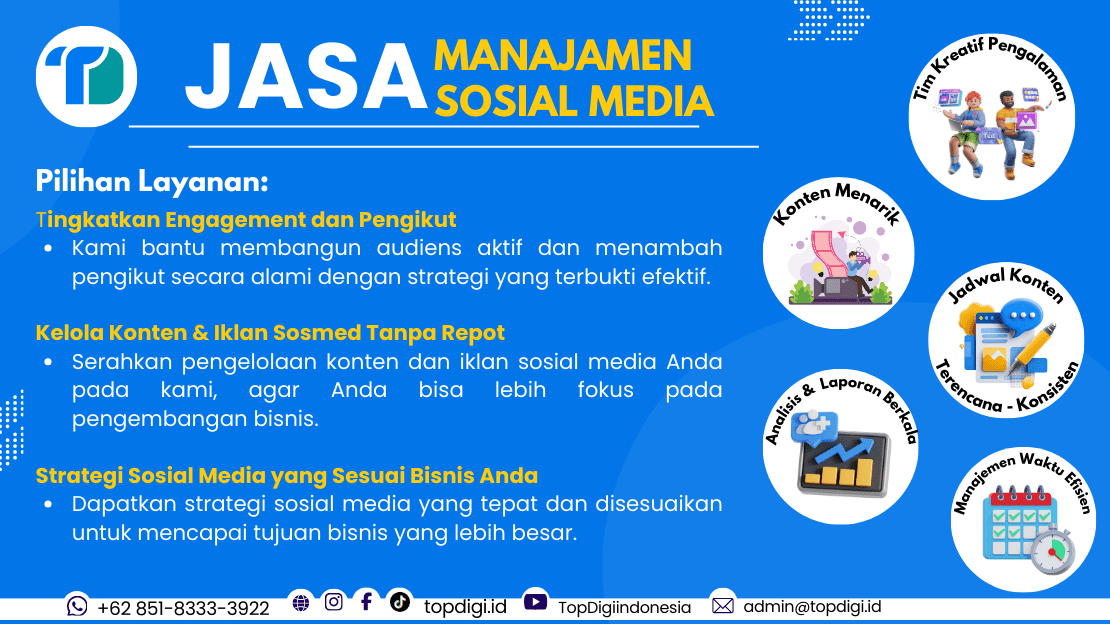 🚀 Dengan TopDigi, kamu akan mendapatkan pengelolaan sosial media yang profesional, strategi yang terukur, dan hasil yang nyata. Kami bantu bisnis kamu untuk berkembang lebih cepat, menjangkau lebih banyak orang, dan mendapatkan hasil maksimal dari platform sosial media!