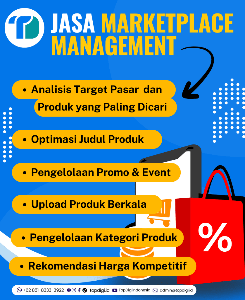 Serahkan pengelolaan marketplace Anda pada tim kami yang tahu bagaimana meningkatkan penjualan, menargetkan pelanggan dengan lebih tepat, dan mengoptimalkan produk agar lebih mudah ditemukan. Ini adalah peluang yang tidak boleh Anda lewatkan β fokus pada bisnis Anda, biarkan kami urus yang lainnya!